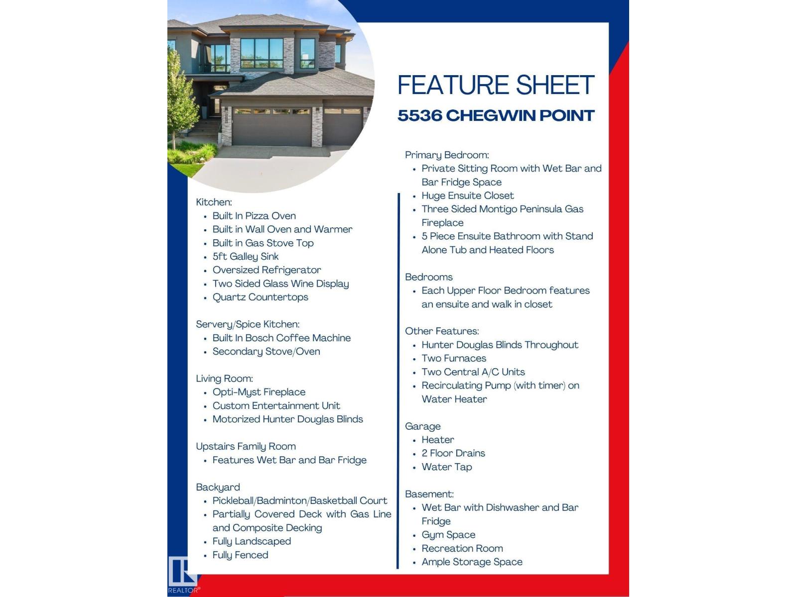 STUNNING 2019 DREAMLIFE LOTTERY GRAND PRIZE HOME! Â Open concept main floor w/ a multitude of upgrades including Opti-Myst fireplace & two-sided, glass-door wine display separate the Kitchen & Dining Room. Â Kitchen has numerous custom features incl: a pizza oven, 5 ft wide galley sink, & two hidden doors leading to a Spice Kitchen. Â On the upper floors, both bdrms have their own ensuites & walk-in closets. Primary bdrm is a true retreat - sitting area complete w/ coffee/bar area & Montigo Peninsula gas fireplace. Â Ensuite belongs in a 5 Star Hotel along w/ the Dressing Room. Â Lower level is equipped w/ gym, rec room & a third wet bar. Manicured, massive, pie lot (1,325 m2) is fully fenced & showcases a multi-game sport court for basketball, pickleball or badminton. Triple Garage. Â Luxurious home is located in a quiet cul-de-sac. Â Easy access to all amenities - Parks, Trails, Schools, Restaurants, Golf, Henday & Airport. Â Unique & functional 5,300+ sq ft property by Award Winning Builder. (id:6365)