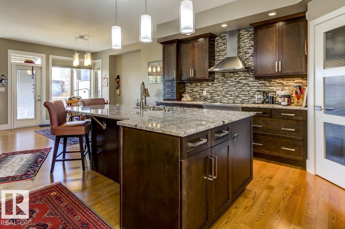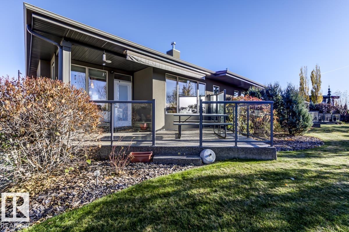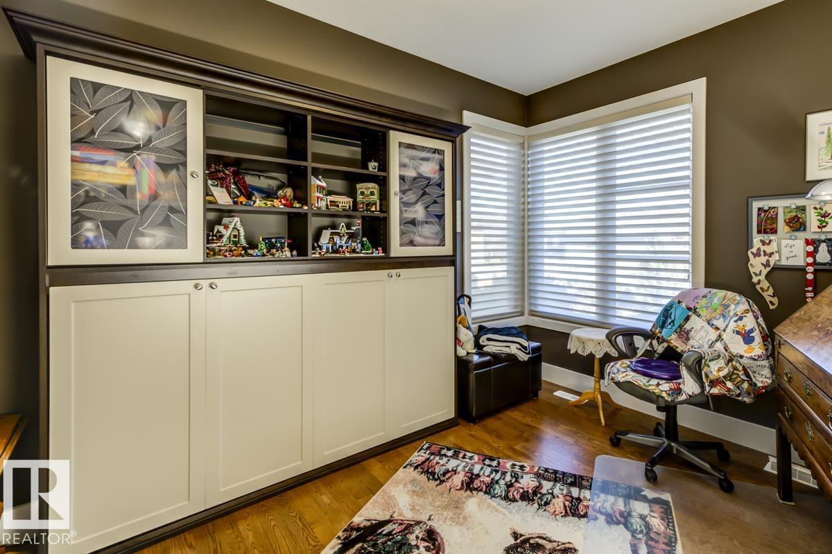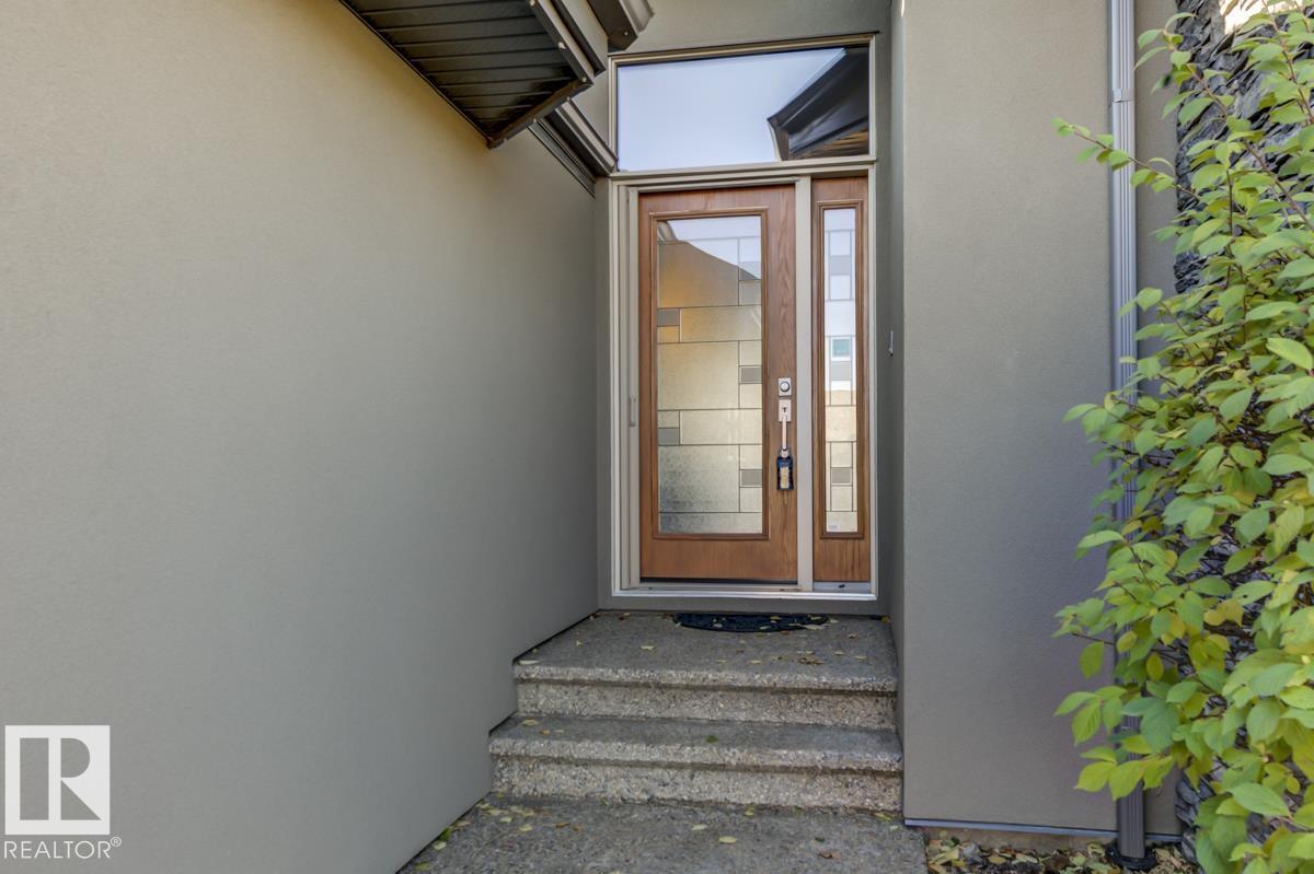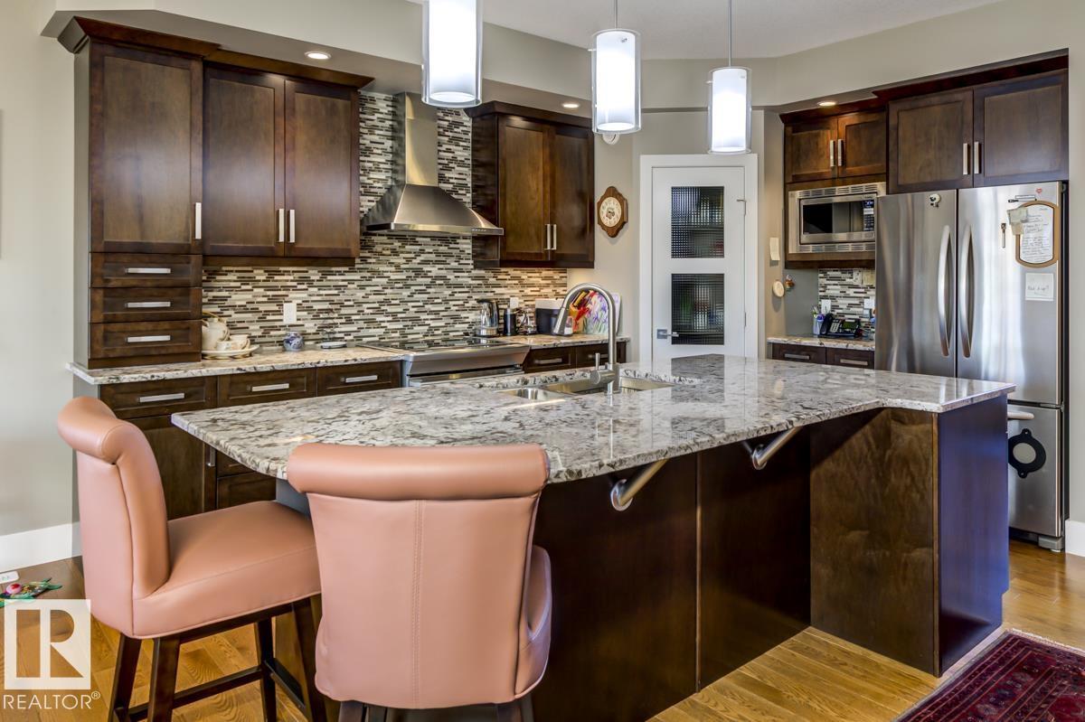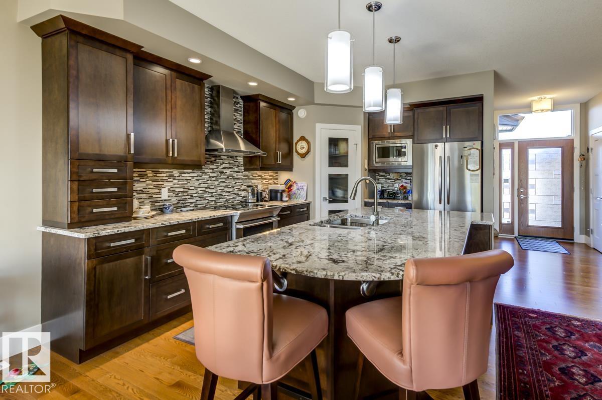 Welcome to this stunning bungalow in the sought-after and prestigious community of Larch Park in Mactaggart, perfectly situated on a quiet cul-de-sac. Thoughtfully designed for comfort and style, this residence features 9-foot ceilings on both levels, a main floor office with a Murphy bed, and a modern kitchen boasting granite counters, stainless steel appliances, pantry, and an oversized island—ideal for entertaining. Enjoy the warmth of gas fireplaces in both the living and rec rooms, or unwind in the west-facing, landscaped backyard with exposed aggregate patio and extendable awning for customizable shade. The primary suite offers a spa-like 5-piece ensuite and walk-in closet, while the fully finished basement impresses with an oversized rec room with wet bar, two generous bedrooms, and ample storage. Additional highlights include main floor laundry, a double attached garage with extra depth, and Green Built certification for energy efficiency. With no condo fees, no shovelling, and no lawn care. (id:6365)